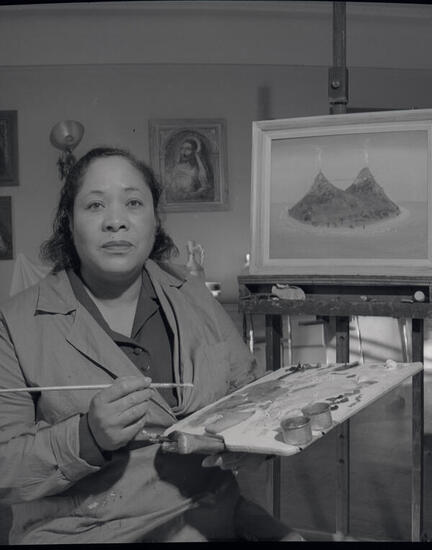 Art by Celebrities Sponsored by the Urban League [Mary Martin holding her painting.]