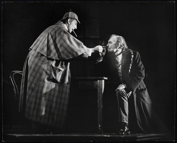 [Philip Locke as Professor Moriarty and John Wood in the title role of "Sherlock Holmes".]