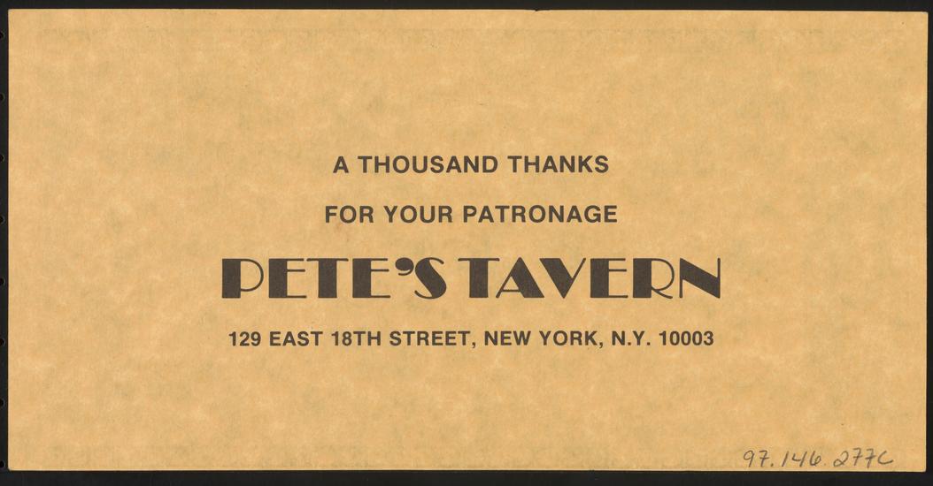 A Thousand Thanks for Your Patronage. Pete's Tavern