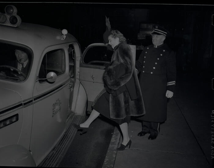 [Hildegarde shaking hands with an unidentified man on a train.]