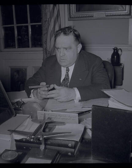 [Mayor Fiorello H. La Guardia listening to a radio at his desk.]