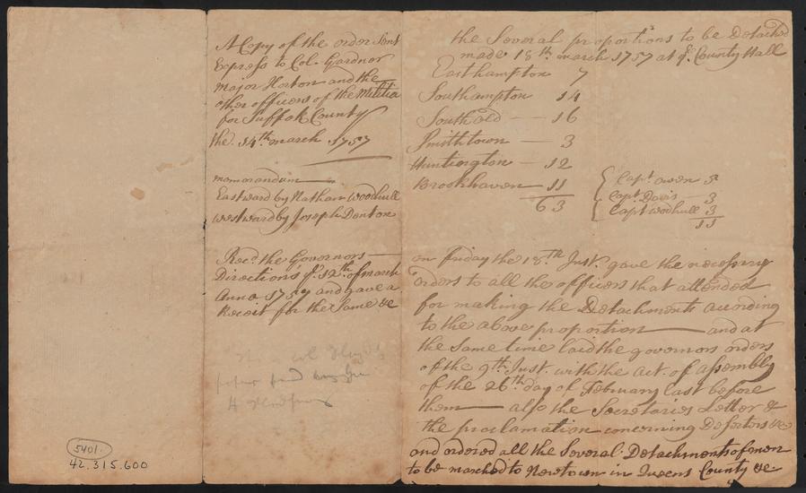 Order issued to Abraham Gardner on March 14, 1757 to assemble the Suffolk County militias