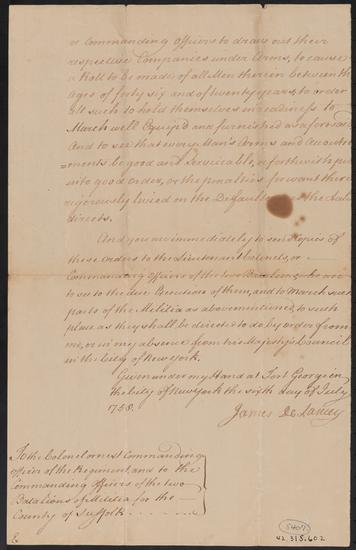 Marching orders issued by James De Lancey to Richard Floyd, July 6, 1758