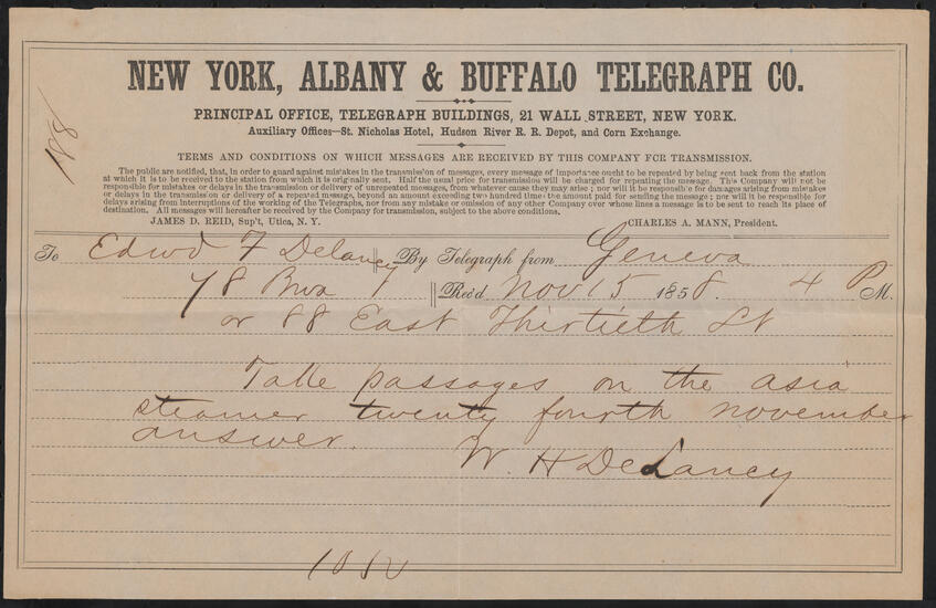 Envelope for telegram from William Heathcote De Lancey to Edward Floyd De Lancey, November 15, 1858