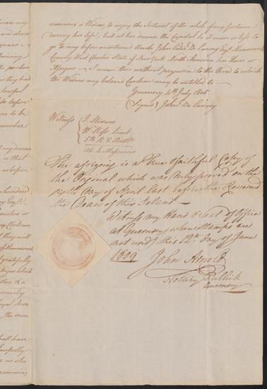 Extract from the will of the late John De Lancey dated Guernsey 4th July 1805 & proved 12th June 1809