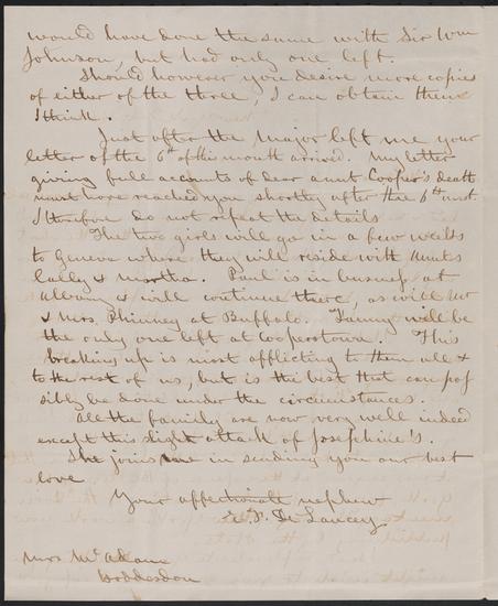 Letter from Edward Floyd De Lancey to Anne Charlotte McAdam, February 24, 1852