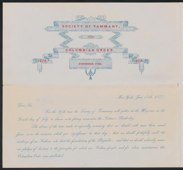 Society of Tammany or Columbian Order Annual Celebration of the 111th Anniversary of American Independence