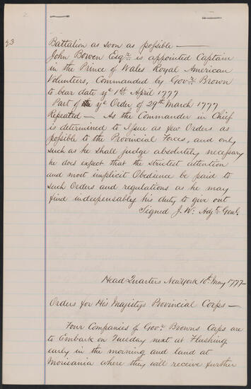 Order book of Oliver De Lancey, February 4, 1777-May 1, 1777, copied by Edward Floyd De Lancey in 1880