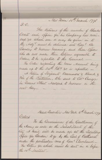 Order book of Oliver De Lancey, February 20, 1778-March 13, 1778, copied by Edward Floyd De Lancey in 1880