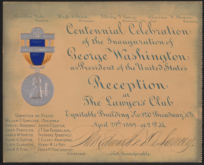 Centennial Celebration of the Inauguration of George Washington as President of the United States. Reception at the Lawyers' Club