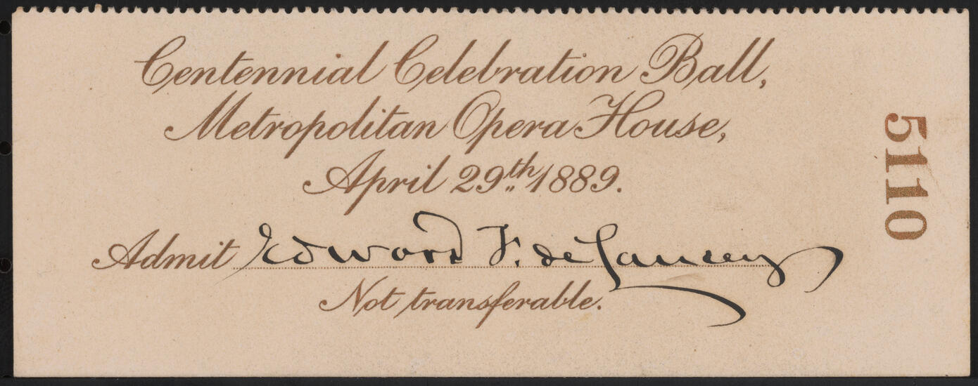 Admission ticket to Edward Etienne De Lancey to attend centennial celebration ball, April 29, 1889