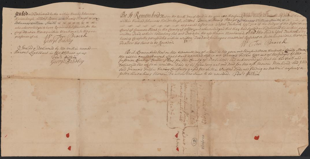 Indenture between Johannis Hardenbergh, Johannes William Smith, Albert Boom and Tounis Hough and Baron Lighthart, and Richard Bradley of New York City, April 8, 173a7
