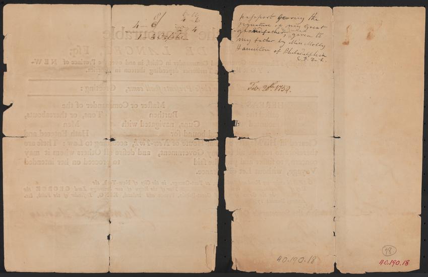 Clearance issued by James De Lancey for a schooner to pass through New York Harbor, February 3, 1759