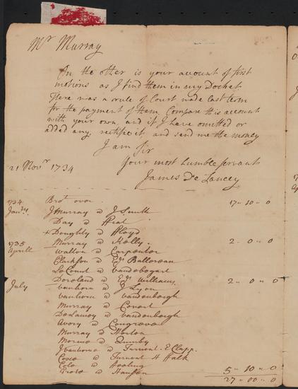Account reconciliation between Joseph Murray and James De Lancey, June 17, 1736