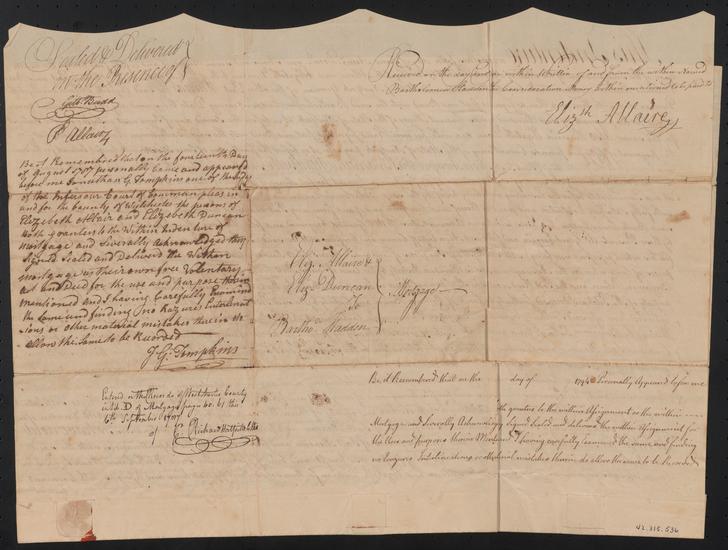 Mortgage between Elizabeth Allaire with Elizabeth Duncan and Bartholomew Hadden, June 5, 1785