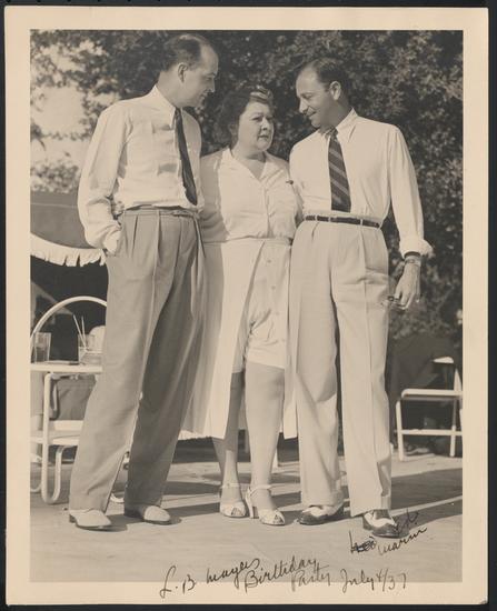 [Louis B. Mayer, Bill Koenig and Sophie Tucker at Mayer's birthday party at Clarence Brown's ranch.]