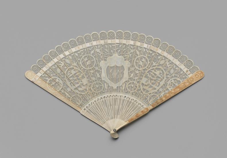 Brisé fan of pierced and carved ivory with original lacquer fan box