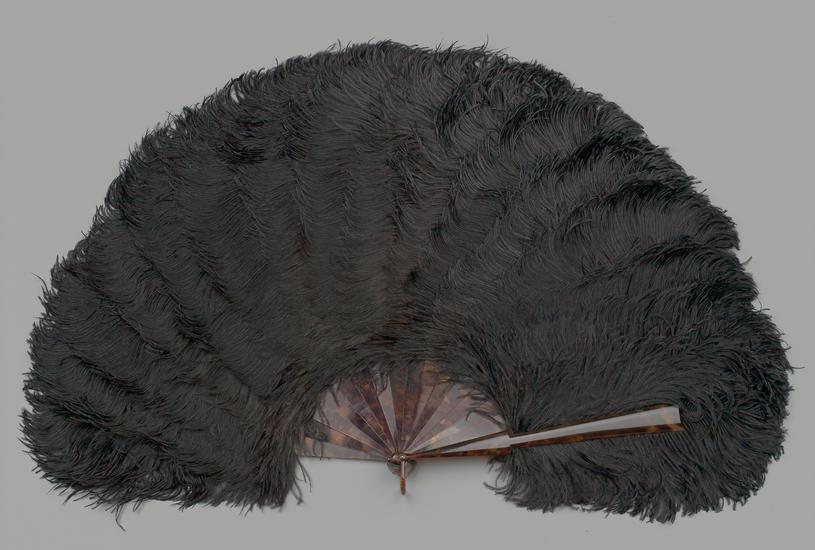 Folding feathered fan of yellow ostrich feathers tipped with birds' heads