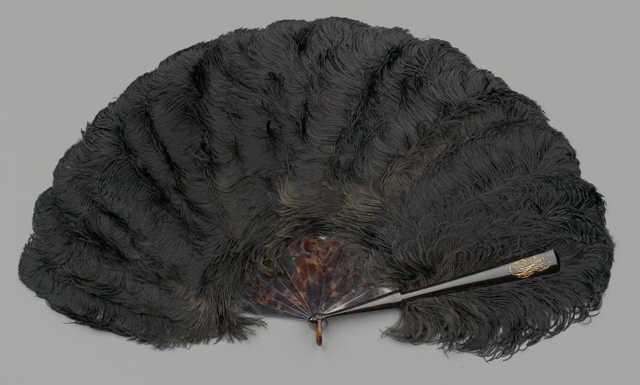 Folding feathered fan of clipped ostrich feathers