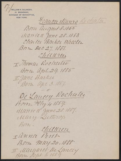 Undated De Lancey family genealogy compiled by William H. De Lancey
