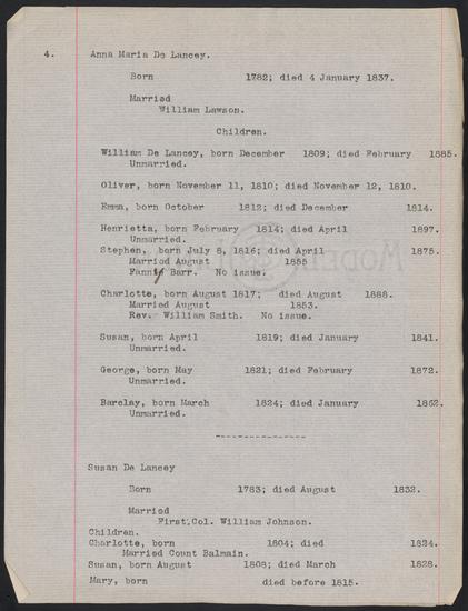 Undated De Lancey family genealogy compiled by William H. De Lancey