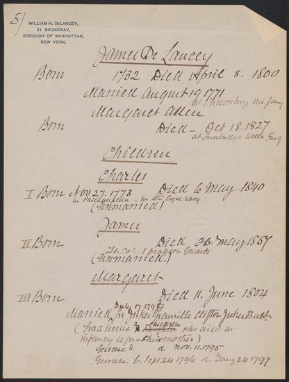 Undated De Lancey family genealogy compiled by William H. De Lancey