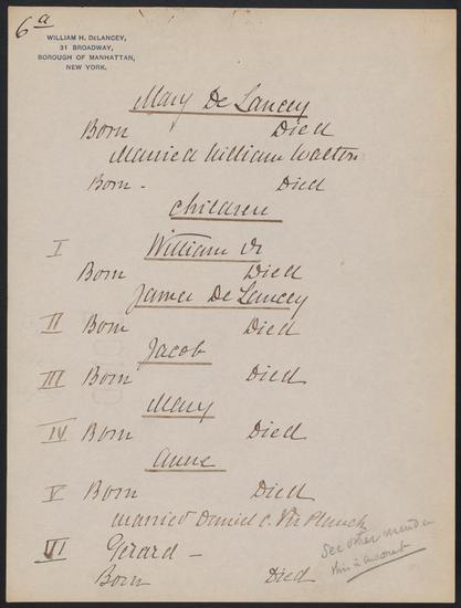 Undated De Lancey family genealogy compiled by William H. De Lancey