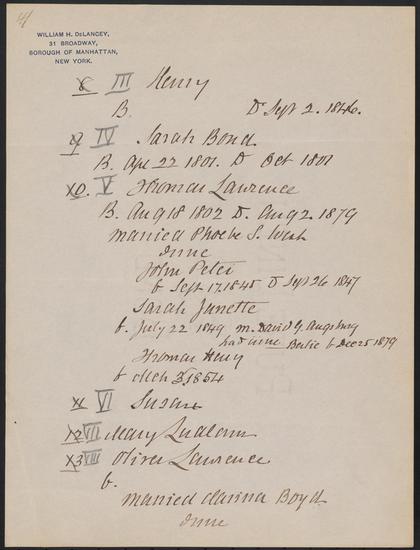 Undated De Lancey family genealogy compiled by William H. De Lancey