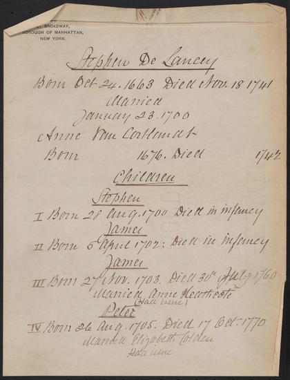 Undated De Lancey family genealogy compiled by William H. De Lancey