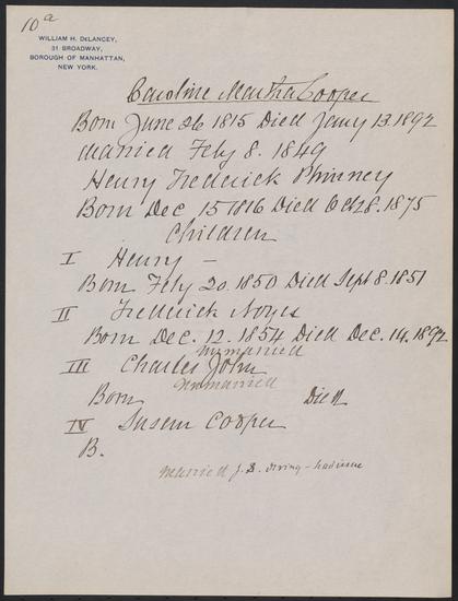 Undated De Lancey family genealogy compiled by William H. De Lancey