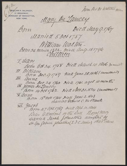 Undated De Lancey family genealogy compiled by William H. De Lancey