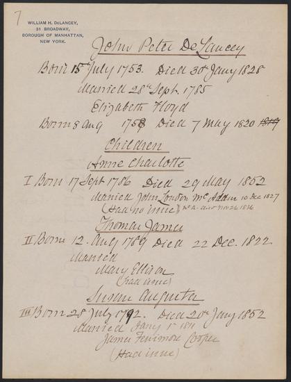 Undated De Lancey family genealogy compiled by William H. De Lancey