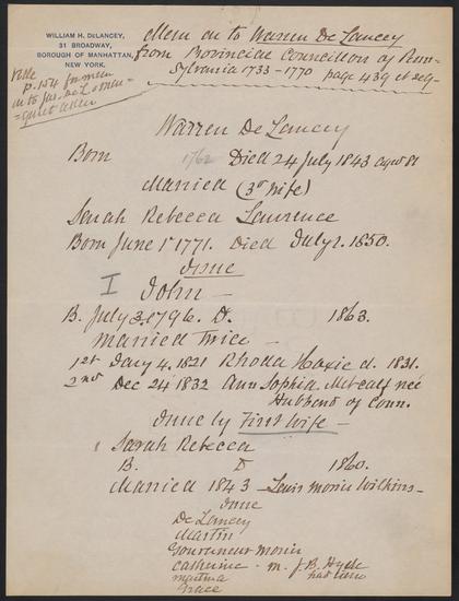 Undated De Lancey family genealogy compiled by William H. De Lancey