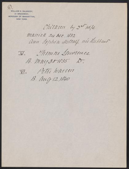 Undated De Lancey family genealogy compiled by William H. De Lancey
