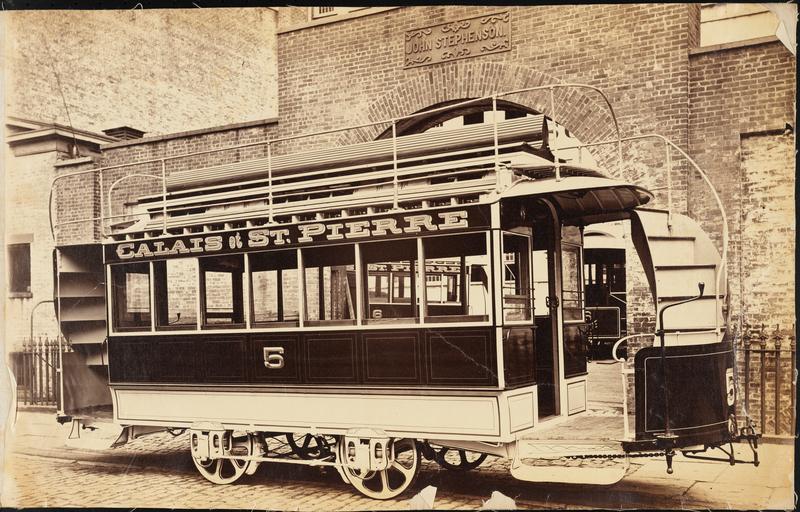 Double-decker Cars [Belgian Street Railway & Omnibus Company Limited streetcar with knifeboard seating on upper deck.]