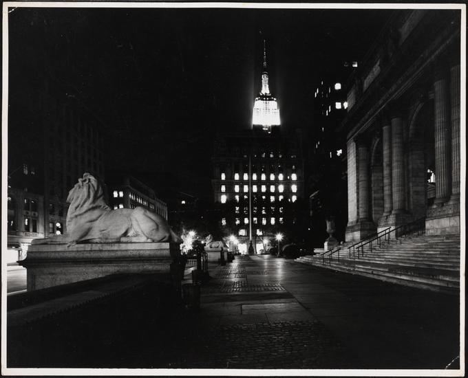 [Looking south from the steps of New York Public Library's main branch toward the Empire State Building.]