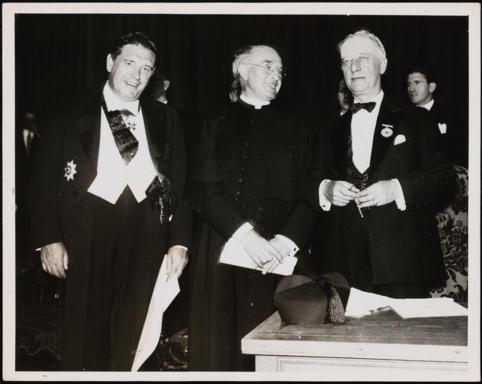 [Al Smith with Hebert Hoover and another man at an automobile show.]