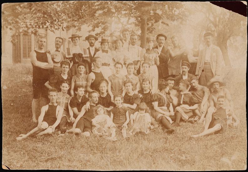 [Al Smith with a large group in a lake.]