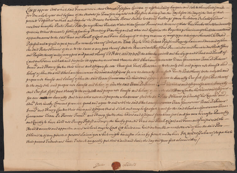Indenture between Pieter Oblienis of Harlem and Abraham Gouverneur of New York City for land called the Dominees Farm, June 13, 1723