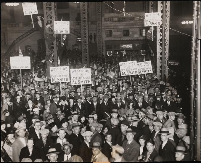[Crowds at a campaign stop for Al Smith.]