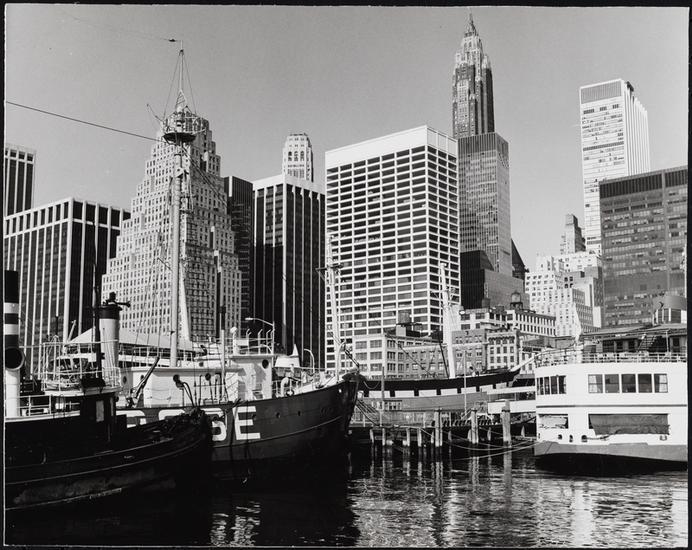 [View of Lower Manhattan skyline from the South Street Seaport.]