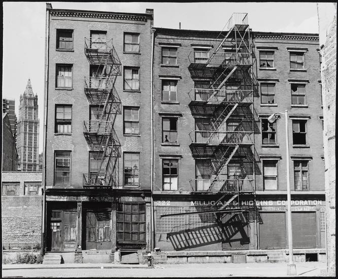 [Looking west from Peck Slip to the twin towers of the World Trade Center.]