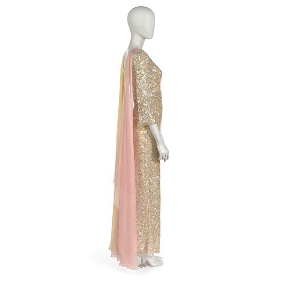 Evening ensemble in geometric printed cotton velveteen, comprising cloak and dress