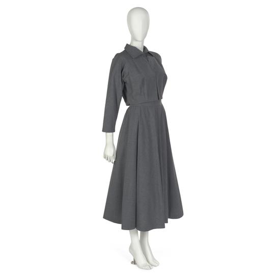 Day ensemble comprising charcoal gray wool flannel jacket and skirt, and yellow silk blouse