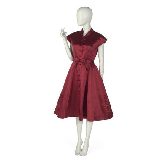 Strapless cocktail dress in cream silk with navy blue and red polka dots