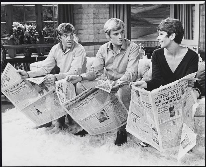 [Gwyda DonHowe as Sharon, Don Francks as Theo, David McCallum as Julian and Monica Evans as Candida in "The Flip Side".]