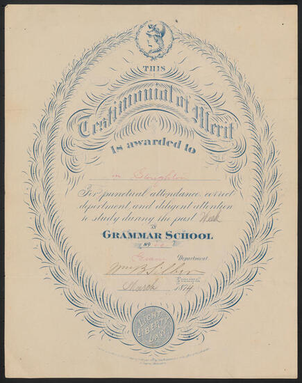 [Testimonial to punctuality, deportment and diligent attention to study.]