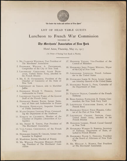 Seating List. Dinner in Honor of the British and French War Commissions Given by the Mayor of the City of New York