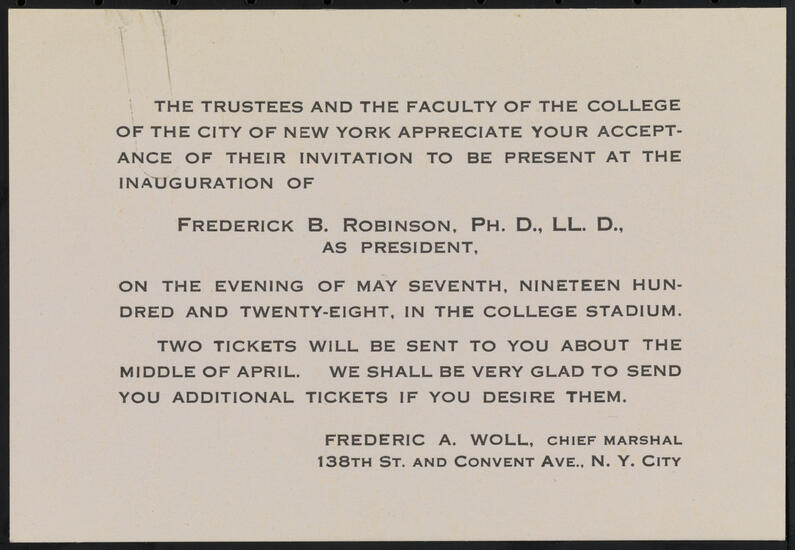 The College of the City of New York Inauguration of Frederick Bertrand Robinson, Ph.D., LL.D.
