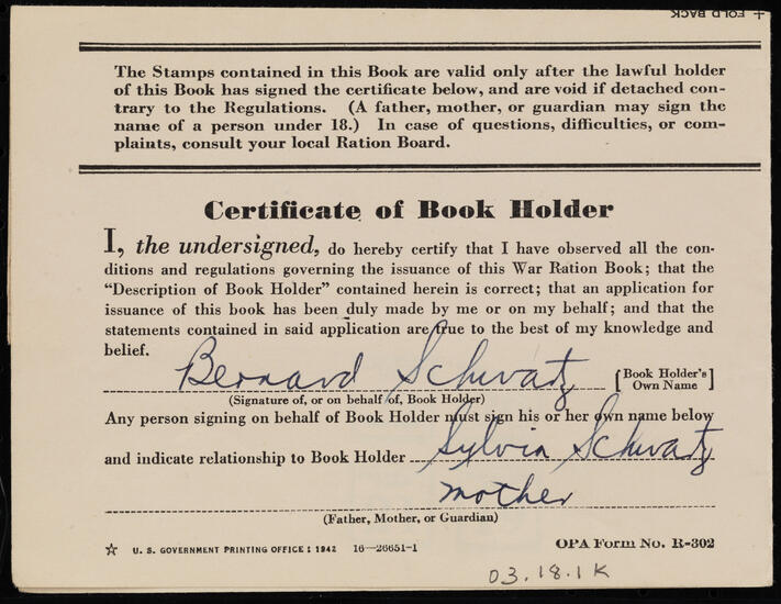 Description Issued to Bernard Schwartz of 845 West End Avenue, New York, on May 4, 1942.